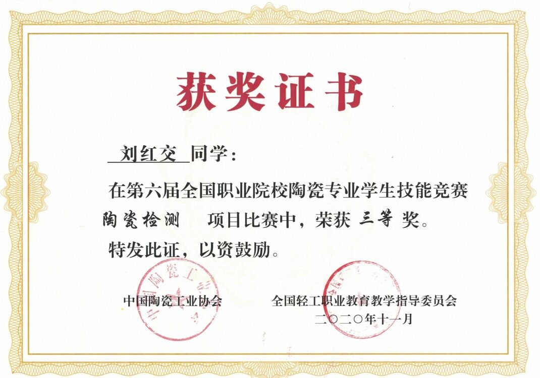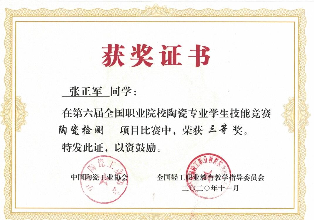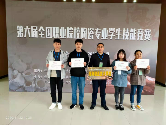 11月21日-11月22日,从2020年第六届全国职业院校陶瓷专业技能大赛组委会传来喜讯,由材料工程系梅朝鲜老师带领的本系4名同学赴江苏宜兴市参加了2020年第六届全国职业院校陶瓷专业学生技能竞赛,经过激烈的技能比拼和理论笔试,我校材料工程系建材184班的陈星宇同学荣获“陶瓷检测”项目比赛一等奖,建材184班王丽娟同学荣获“陶瓷检测”比赛二等奖,建材184班的张正军和刘红交同学荣获“陶瓷检测”比赛三等奖,梅朝鲜老师荣获优秀指导教师奖。