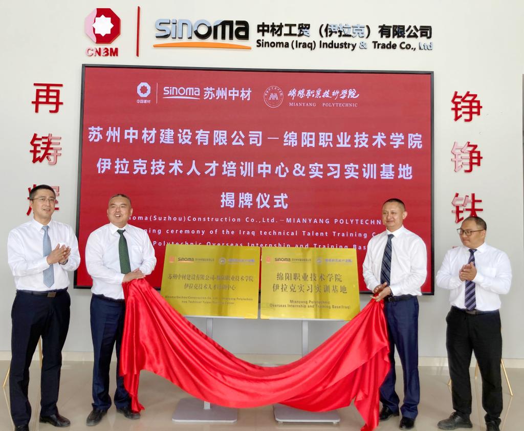 出访期间,王荣海与苏州中材建设有限公司SCP项目总经理龚腾共同为“苏州中材建设有限公司-绵阳职业技术学院伊拉克技术人才培训中心”和“绵阳职业技术学院伊拉克海外实习实训基地”揭牌。据了解,该中心将聚焦水泥生产、光伏能源等领域,通过标准化课程体系开发、师资联合培养等方式,定向培育适应伊拉克本地产业需求的技术人才,探索“海外实训+技术输出+文化传播”的新型育人模式。